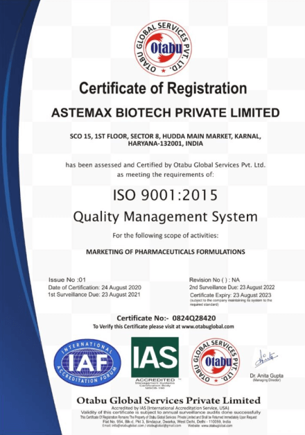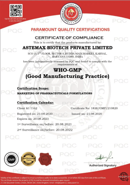 Astemax Biotech is a trusted WHO GMP certified pharmaceutical company in India, known for its commitment to ethical marketing practices and high-quality healthcare solutions. With a strong foundation in pharmaceutical manufacturing and marketing, we follow transparent, responsible, and compliance-driven processes to deliver safe and effective medicines across the country.
