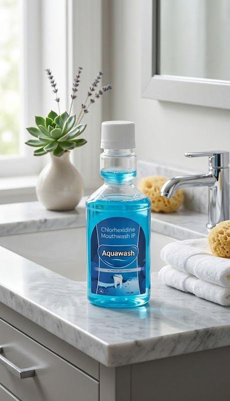 Aquawash is a strong yet safe chlorhexidine mouthwash with mint flavor from Astemax Biotech, designed for effective oral antisepsis.