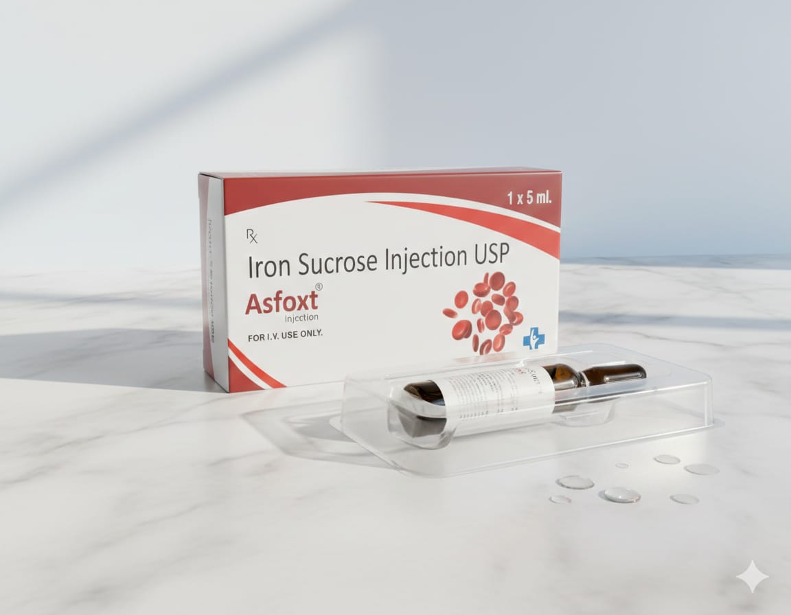 Asfoxt Inj is an intravenous iron sucrose formulation designed to rapidly correct iron deficiency anemia, particularly in patients with chronic kidney disease or those intolerant to oral iron supplements. It delivers essential iron directly into the bloodstream, bypassing gastrointestinal absorption issues for faster hemoglobin recovery.