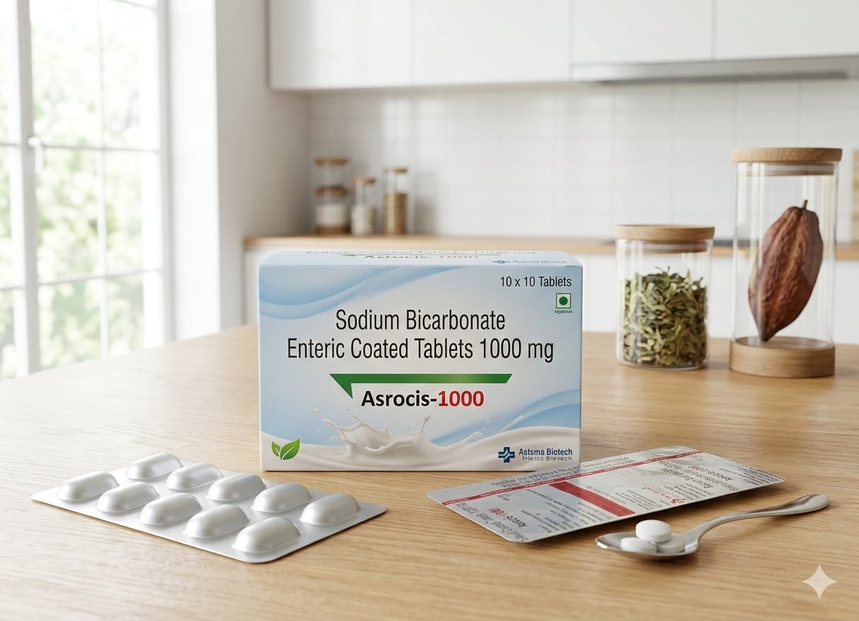 Asrocis 1000 is a premium enteric-coated tablet from Astemax Biotech, delivering high-purity sodium bicarbonate for effective renal acidosis management.
