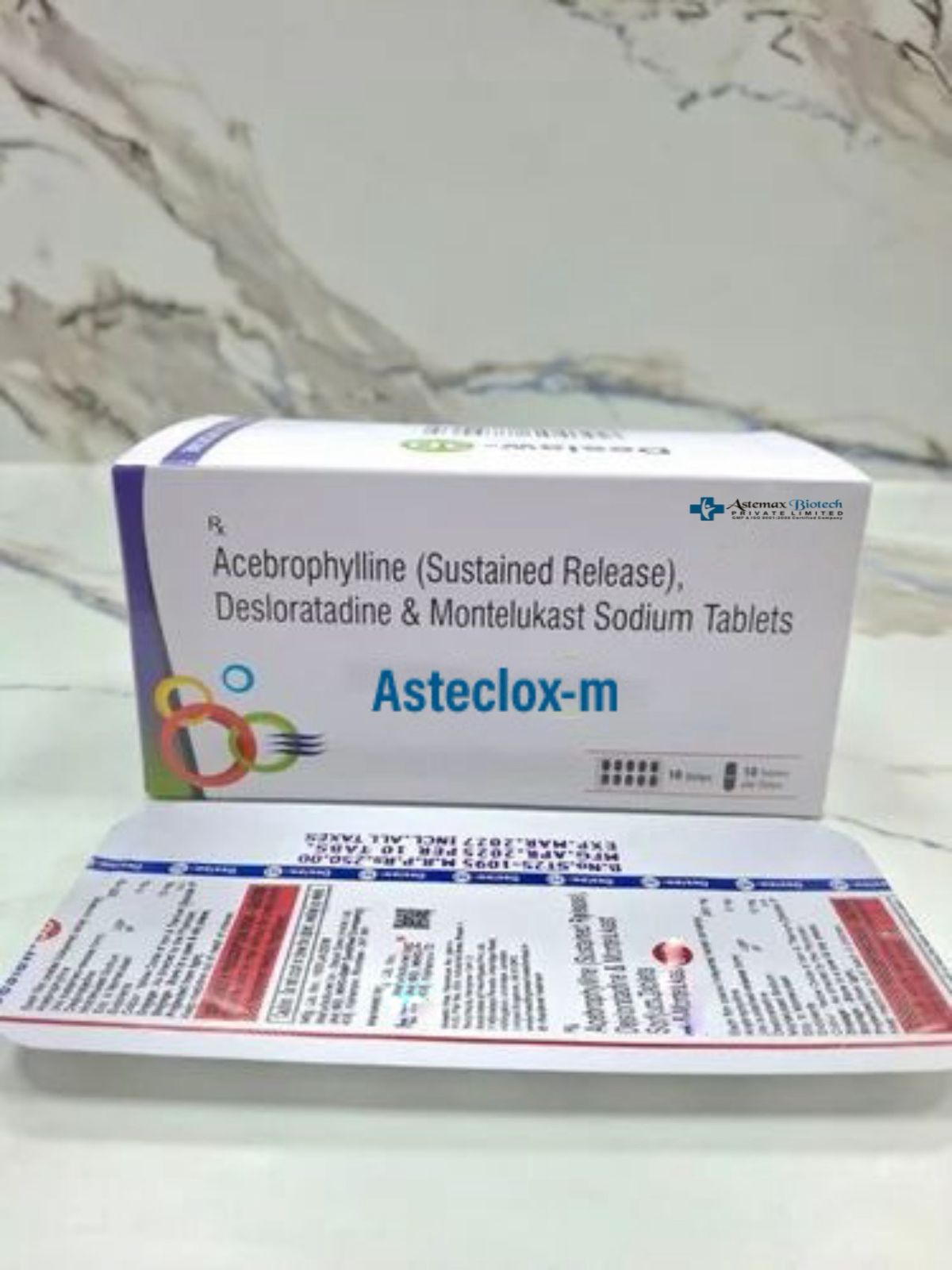 Asteclox M from Astemax Biotech is a triple-action respiratory tablet combining desloratadine, acebrophylline, and montelukast for comprehensive allergy and asthma relief.