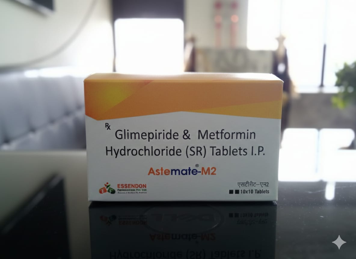 Essendon Formulations Pvt. Ltd., based in Karnal, Haryana, serves as the manufacturing partner specializing in high-quality generic formulations. They produce ASTEMATE M2 under strict GMP standards, ensuring bioavailability and stability for reliable glycemic control in the Indian market.