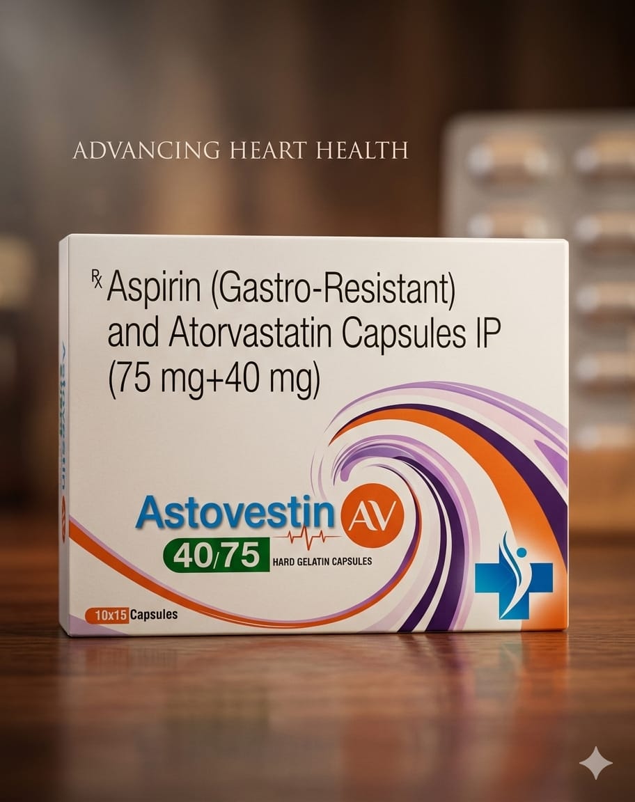 Astovestin AV is a dual‑action cardioprotective fixed‑dose combination that merges low‑dose aspirin (enteric‑coated/gastro‑resistant) with atorvastatin 40 mg in a single capsule. It is designed for secondary prevention and high‑risk primary prevention of cardiovascular events such as heart attack, stroke, and atherosclerotic cardiovascular disease.