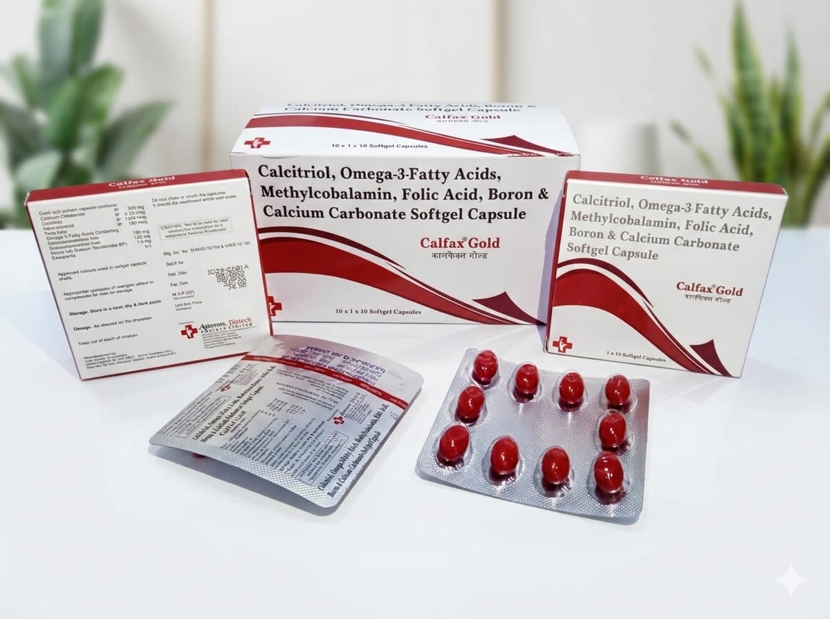Calfax Gold is a multifunctional nutraceutical formulated as a bone‑health + nerve‑health + cardiovascular‑support combination. Omega‑3 (EPA + DHA) supports heart health, vascular function, and mild anti‑inflammatory action, while calcium carbonate and calcitriol help maintain bone mineralization and calcium balance. Methylcobalamin aids nerve‑tissue repair and myelin maintenance, and folic acid supports homocysteine metabolism and overall cellular health; boron acts as a co‑factor in bone and mineral metabolism.