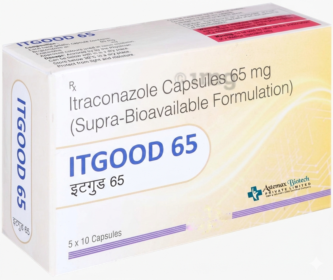 IT Good 65 mg is an advanced supra-bioavailable capsule from Astemax Biotech, featuring Itraconazole 65 mg in a cutting-edge formulation for superior fungal infection control.