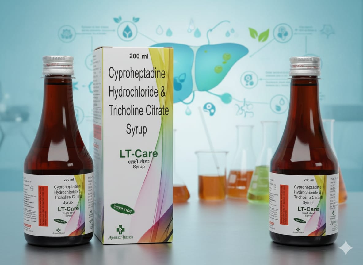 LT Care H is a syrup formulation containing Cyproheptadine Hydrochloride (typically 2 mg) and Tricholine Citrate (typically 275 mg per 5 ml), manufactured by Astemax Biotech for appetite stimulation and liver support.