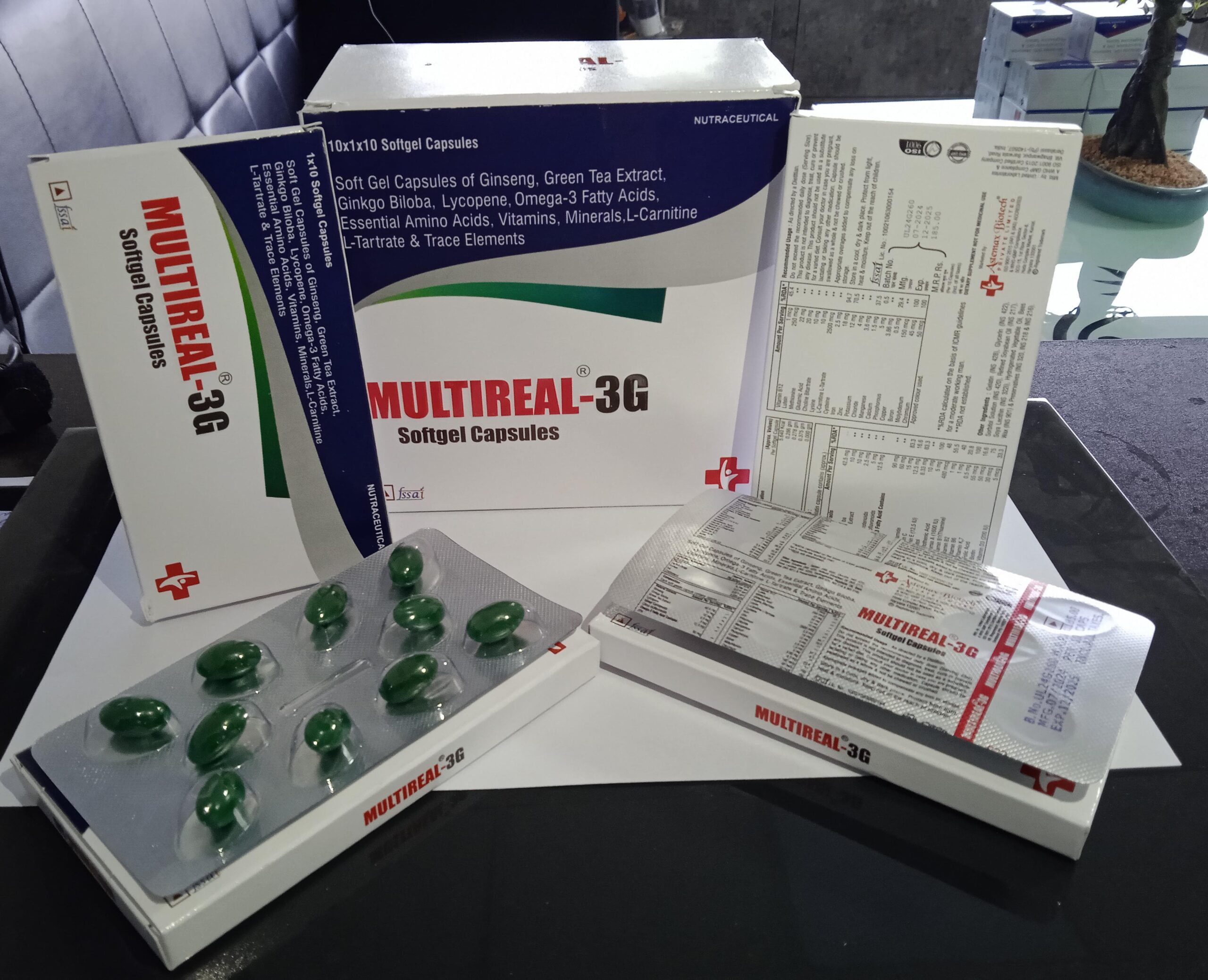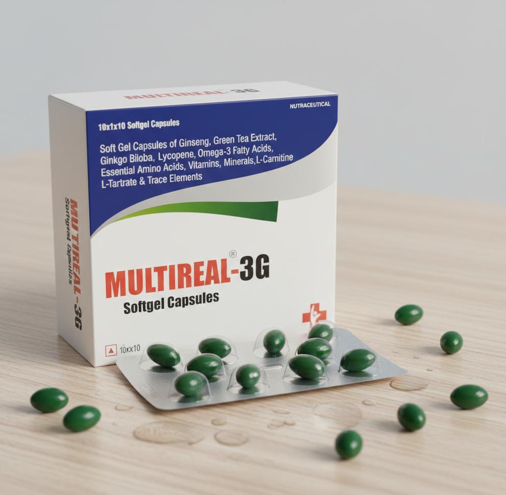 Multireal 3G is a nutritional supplement capsule commonly used in India for addressing vitamin and mineral deficiencies. It typically contains a blend of multivitamins, multiminerals like elemental magnesium, calcium, copper, and vitamin C, supporting overall health and vitality.