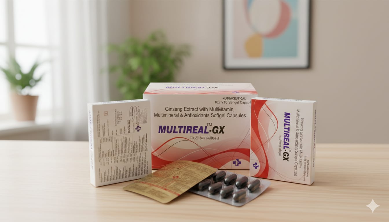 Multireal GX is a popular nutraceutical softgel capsule from Astemax Biotech Pvt. Ltd., formulated as an energy booster with Ginseng Extract 90 mg alongside multivitamins, minerals, and antioxidants.