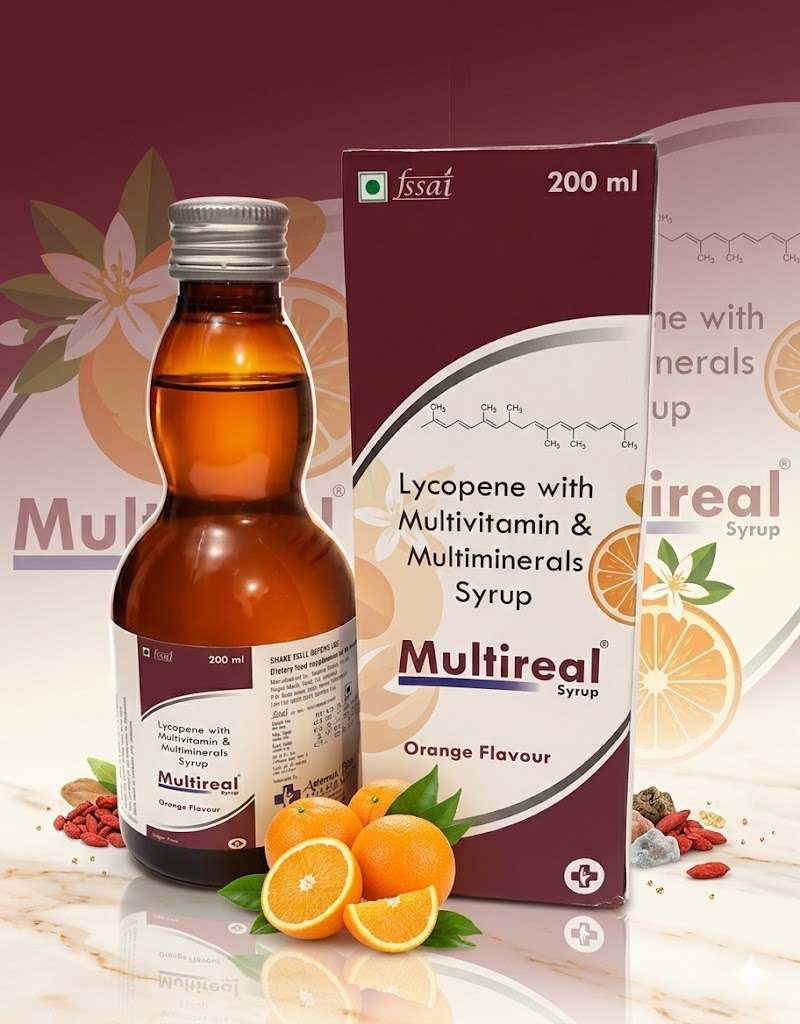 “Multireal Syrup – 200 ml Orange‑Flavoured Syrup with Lycopene 6%, Niacinamide 25 mg, Pyridoxine 1.5 mg, Cyanocobalamin 1 mcg, and Folic Acid 100 mcg – Nutritional Support for Growth, Energy, and Recovery – by Astemax Biotech.”