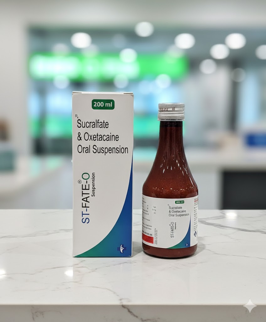 ST Fate O Syrup is Astemax Biotech’s WHO-GMP certified 200 ml oral suspension combining Sucralfate and Oxetacaine, providing dual-action protection and pain relief for gastric conditions.