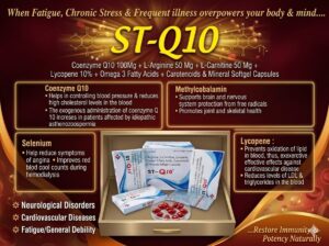 ST-Q10 Softgel Capsule is Astemax Biotech’s premium Coenzyme Q10 (CoQ10) 100 mg formulation, enriched with L-carnitine, omega-3 fatty acids, and L-arginine for comprehensive cardiovascular and energy support.