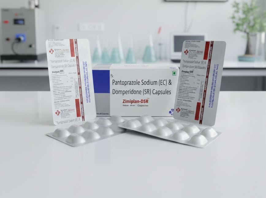 Zimiplan DSR by Astemax Biotech is an advanced sustained-release capsule combining pantoprazole gastro-resistant pellets with domperidone prolonged-release pellets, offering 24-hour relief from acid reflux and digestive discomfort. This dual-action formula ensures superior efficacy through optimized release technology, produced in WHO-GMP certified facilities for uncompromising quality and ethical standards.